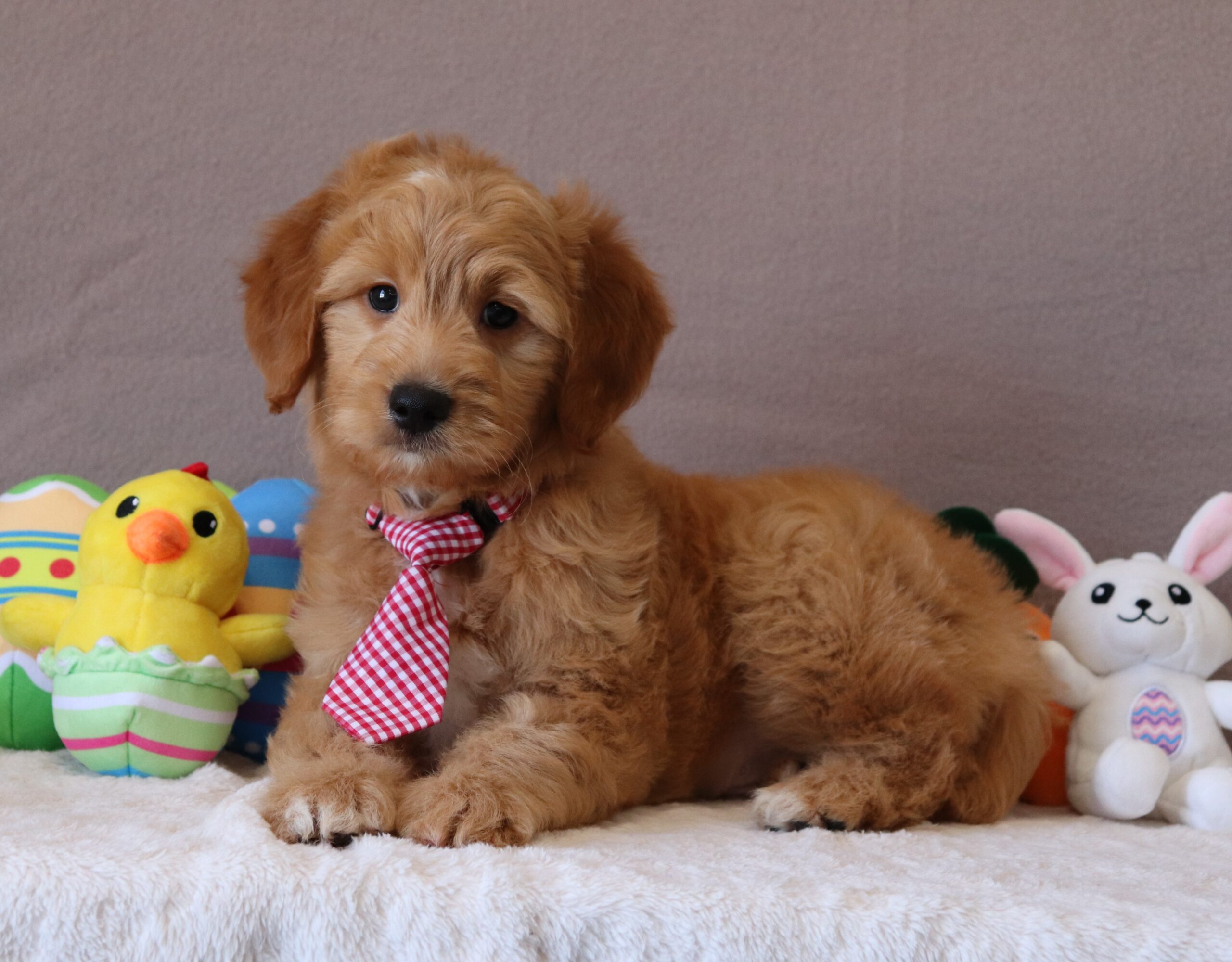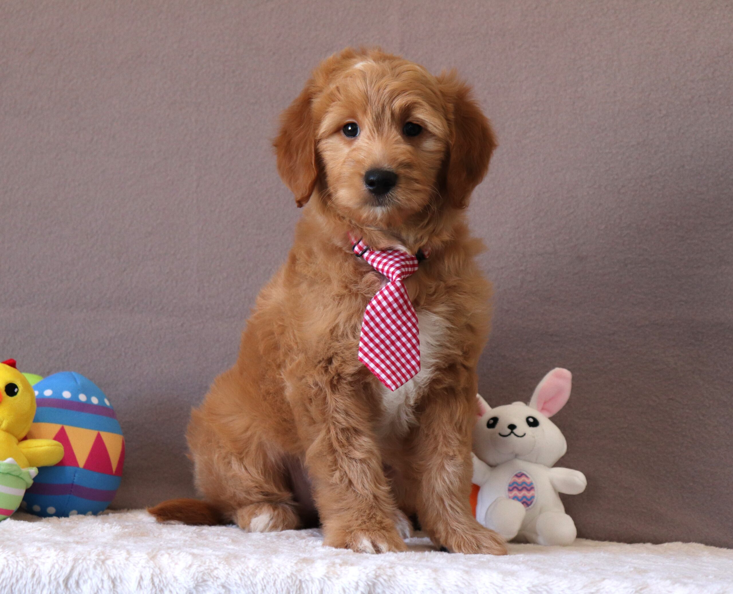 Hello, this is Harris! He’s a cute looking little Mini Goldendoodle boy with a nice red/white, soft, furry coat and 2 shining eyes. He loves to play with his siblings and also loves to be held and cuddled! He will be sure to shower you with lots of kisses!